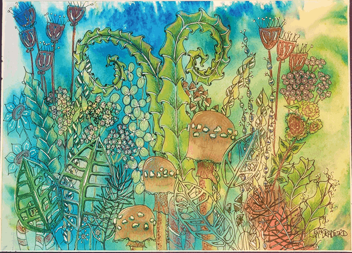 This piece isn't just a visual treat; it's a playful escape into a dreamlike forest where every glance reveals something new. Lori's use of bright colors and meticulously drawn details creates a lively, enchanting feel. Let your imagination wander through this magical tapestry of undergrowth!