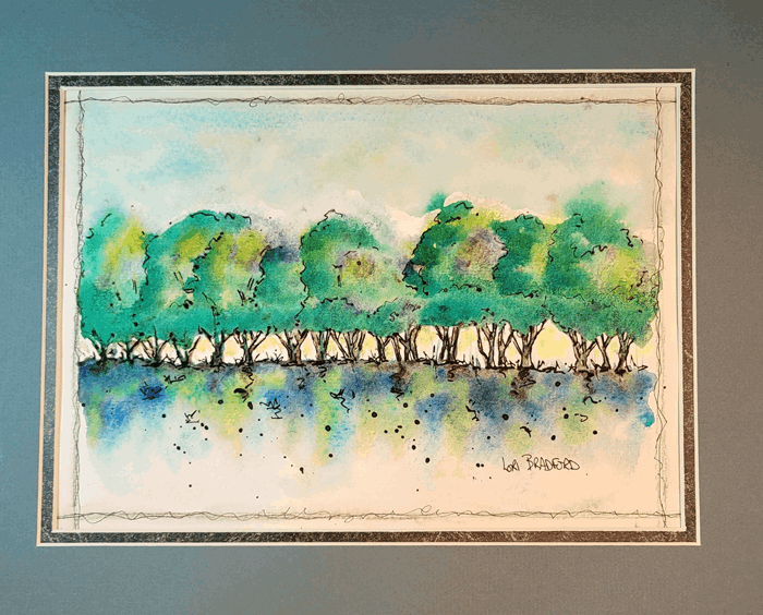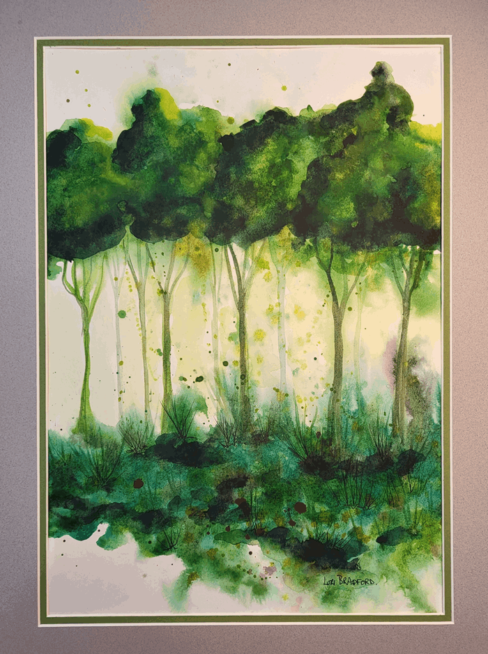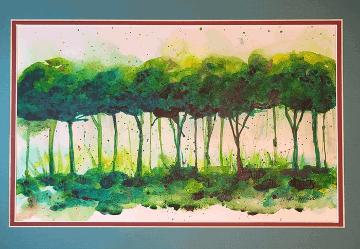 The trees seem to whisper secrets of the woods, as the green hues glide seamlessly across the paper. Fluid and loose brushstrokes contribute to its dreamy, abstract quality.
