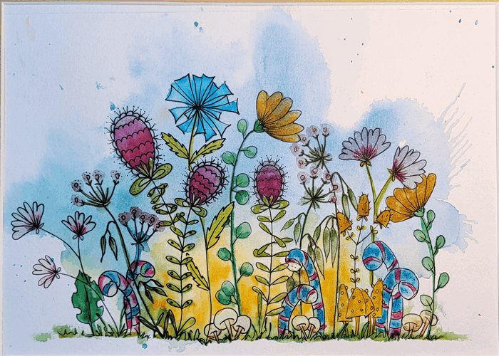 A delightful explosion of color and whimsy. Bright pinks, blues, and yellows, bring the flowers to life, their petals reaching out exuberantly from a bed of green foliage. Each stem and leaf is meticulously detailed with delicate lines, adding an intricate, almost enchanting touch to the scene.