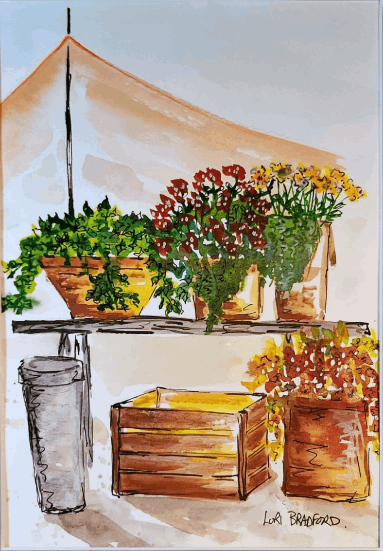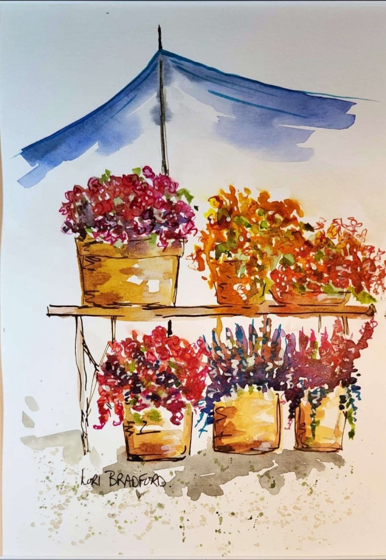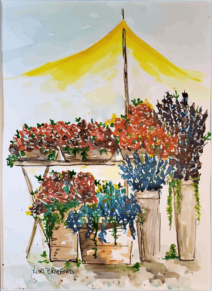 A delightful watercolor painting that captures the vibrant hustle and bustle of an outdoor flower market. The umbrella’s warm yellow hue adds an extra splash of joy, making the market seem even more inviting.