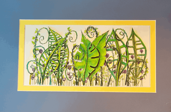 Inspired by the enchanting world of fantasy and the magical microcosms often found on forest floors, this artwork brings together elements of ferns, vines, and leaves in a joyous celebration of nature's complexity and playfulness. Each leaf and vine has its own personality, coming together to form a harmonious and enchanting composition that's sure to captivate and charm anyone who steps into this leafy ballet.