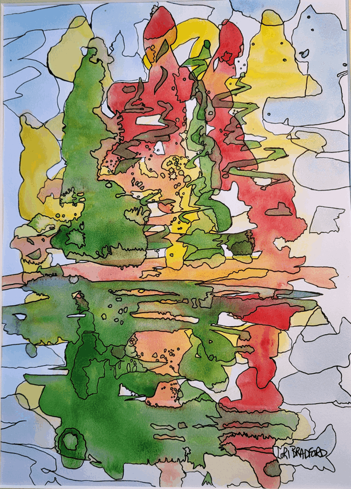 The fluidity of the watercolor technique is evident, creating an impressionistic and natural scene, possibly evoking the feeling of a landscape reflected in water. The interaction of colors and shapes creates a visually engaging and harmonious piece.
