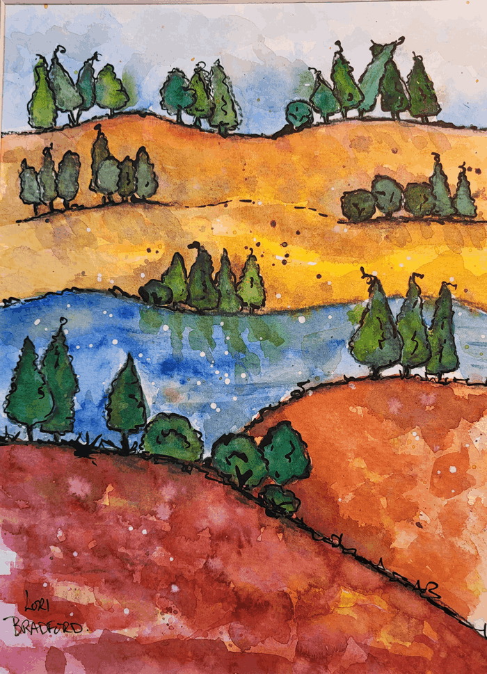 This artwork is a colorful landscape painting with a whimsical and abstract style. Adding to the magic, a blue water body slices through the middle ground, reflecting the kaleidoscopic wonder of its surroundings. The playful interplay of watercolor techniques brings the scene to life, combining strong, defining outlines with soft, dreamlike blends of color. The textures and rich hues make the landscape appear almost animated. Dive into this joyous celebration of nature's whimsy and let your imagination soar with every delightful detail!