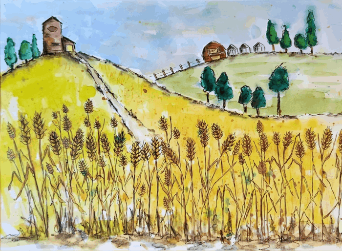 Step into a sunny, countryside day. This painting has a serene and playful aura. Escape into the heart of the countryside, where every element whispers of farming life, old barns, and golden wheat fields.